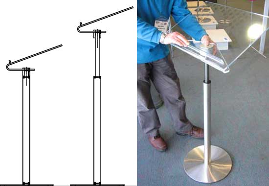 . I had seen adjustable lecterns on the past that seemed to often give way. I hit on the idea of using a gas strut. I was able to arrange it so that the button was where the telescope joined the lectern top, making it easy to reach but not possible to adjust by mistake. This is Ruben, a volounteer at the Hillsong conference testing the lectern for wheelchair users. See www.procson.com.au