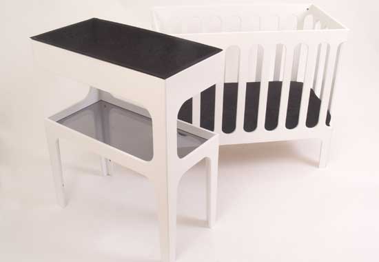 is a new take on an essential piece of baby furniture. The upholstered tray on the top is removable so that it can be used as a table after the baby has grown up. The table uses common knock down style fittings and can be quickly assembled from a flat package.